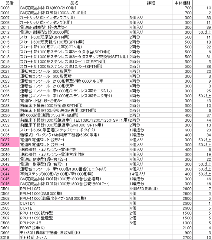 下記のリストに掲載の無いものは販売はありません